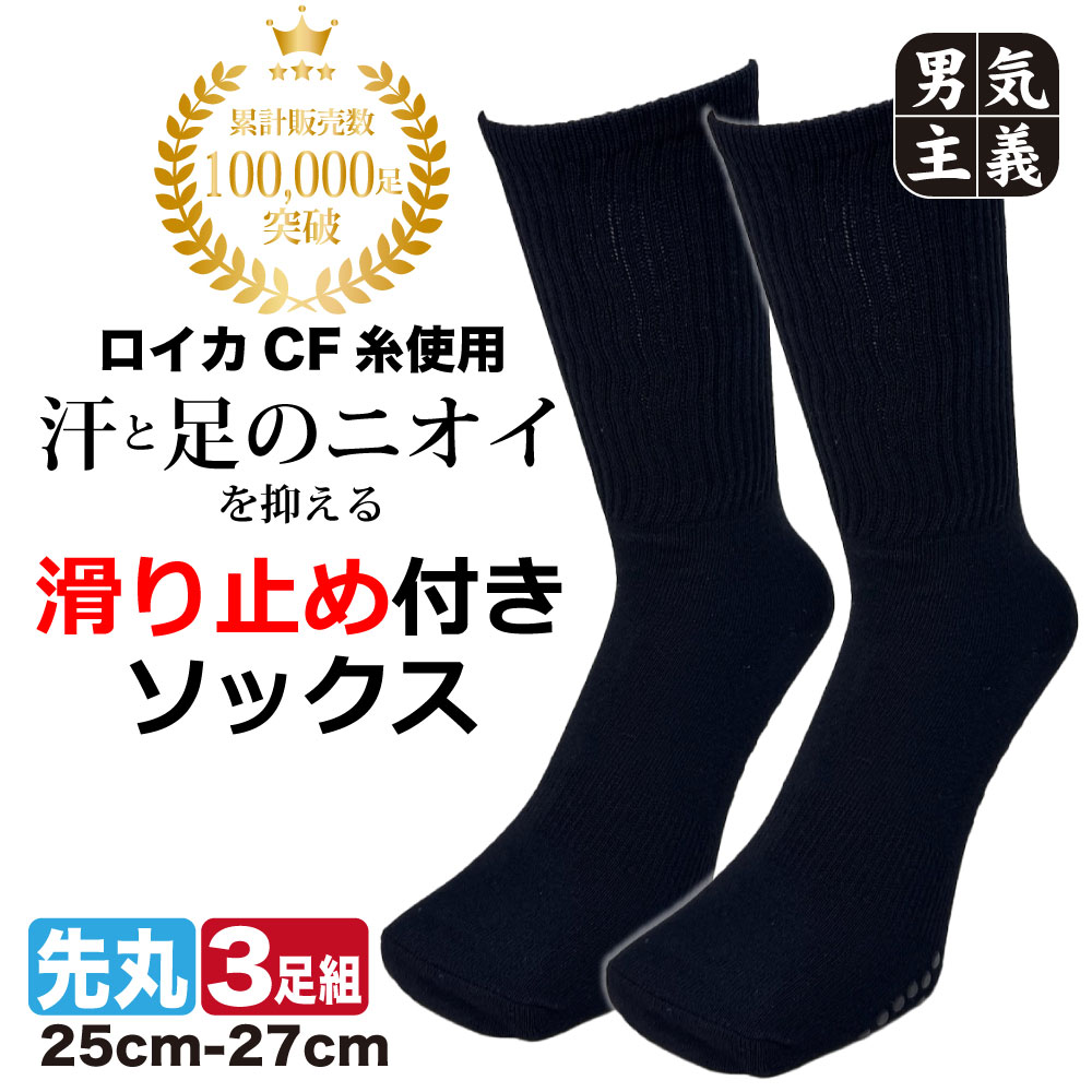 靴下 メンズ すべり止め 消臭 旭化成ロイカCF 先丸 シリコングリップ ソックス 3足セット クルー丈 25cm-27cm 黒 スポーツ ワーク