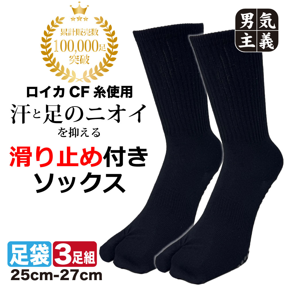 靴下 メンズ 足袋 すべり止め 消臭 旭化成ロイカCF 指付 シリコングリップ ソックス 3足セット クルー丈 25cm-27cm 黒 スポーツ ワーク
