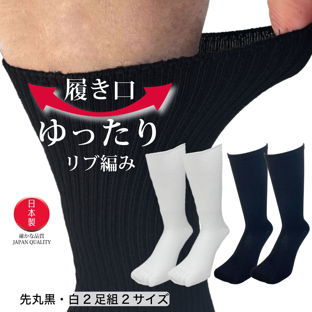 靴下 メンズ ビジネス 日本製 履き口ゆったり 締め付けない 足首サポート クルー丈 2足組 黒 白 25cm-27cm/27cm-29cm