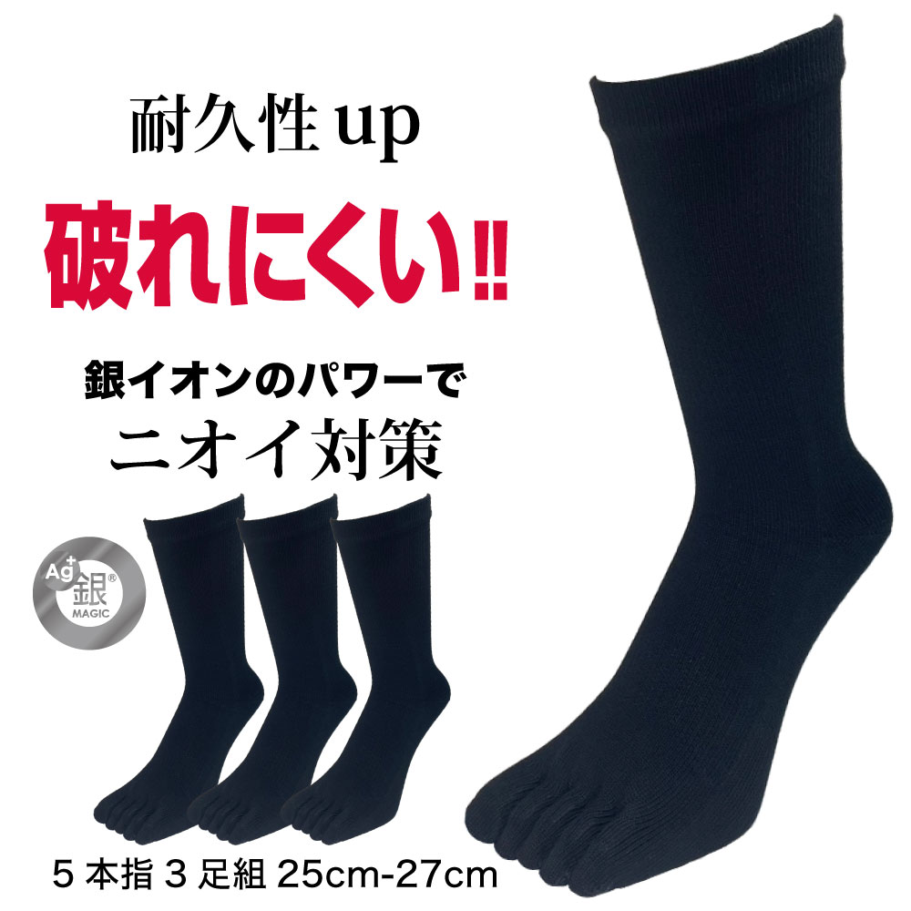 五本指ソックス メンズ 強靭 破れにくい 銀イオン 消臭 抗菌防臭 クルー丈 3足セット 銀マジック 25cm-27cm