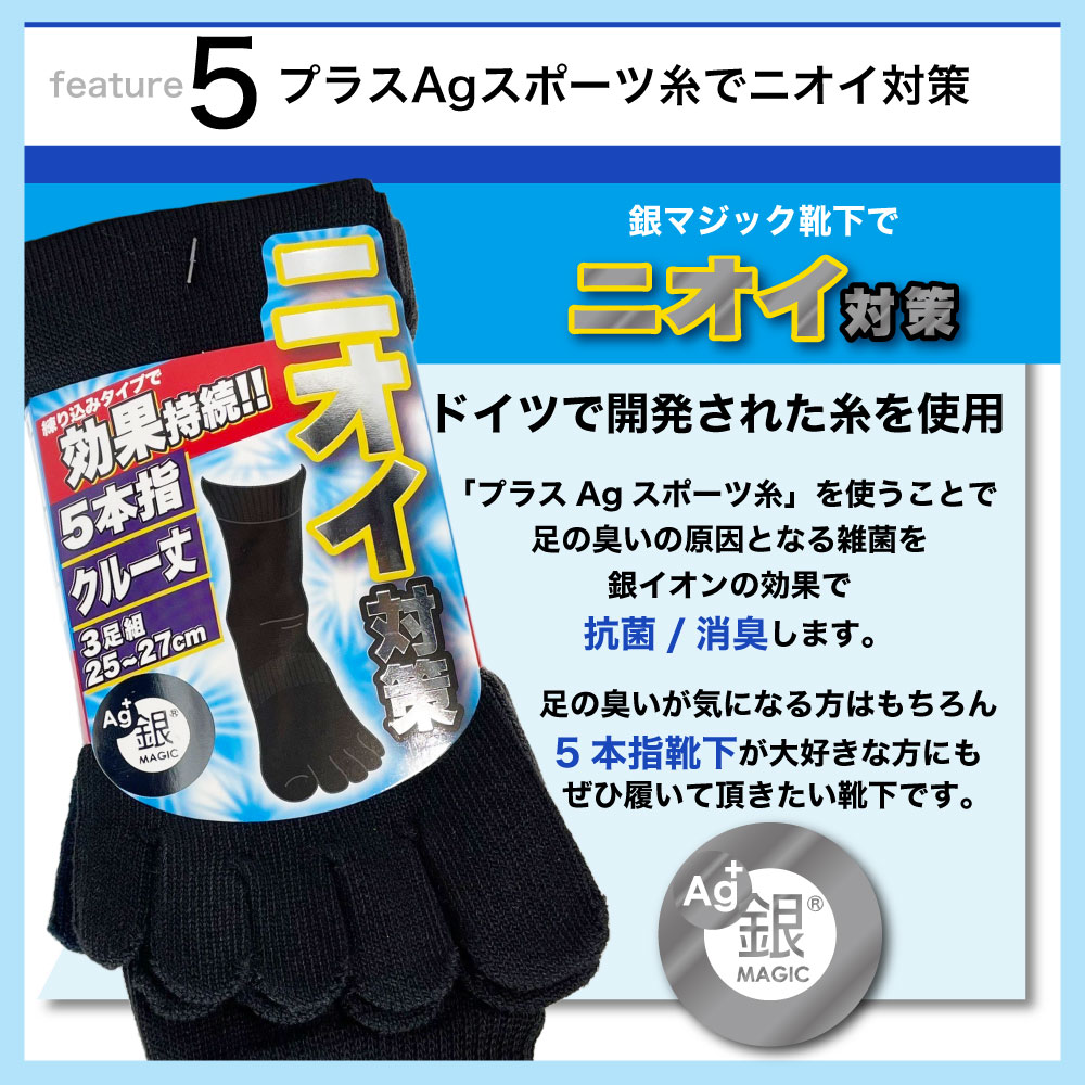 銀マジック5本指クルー丈ソックス3足組 ■ 材質 ポリエステル・綿・ポリウレタン ■ サイズ 25cm-27cm/27cm-29cm ■ カラー 3色アソート(黒/紺/チャコール)/黒単色/紺単色/グレー単色 ■ 容量 3足 ■ メーカー PAX-ASIAN ■ 生産国 中国 ■ 特徴 PAX-ASIANの「銀マジック 五本指クルー丈ソックス」3足組。指ごとに独立した五本指タイプで、ムレを防ぎ足指を快適にキープ。抗菌防臭効果のある銀マジック繊維を使用しているため、気になるニオイ対策にも効果的です。さらにクルー丈仕様で、作業靴やスニーカーにも合わせやすく、毎日の仕事からスポーツ、普段使いまで幅広く活躍。吸汗速乾性にも優れ、汗をかくシーンでもさらっと快適。耐久性が高く、デイリーユースに嬉しい3足組でコストパフォーマンスも抜群です。 |